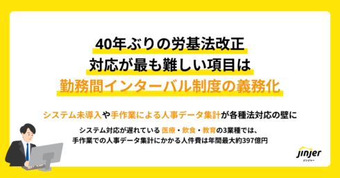 40年ぶりの労基法改正、対応が最も難しい項目は「勤務間インターバル制度の義務化」。 「システム未導入」や「手作業による人事データ集計」が各種法対応の壁に。 システム対応が遅れている「医療」・「飲食」・「教育」の3業種では、 手作業での人事データ集計にかかる人件費は年間最大約397億円