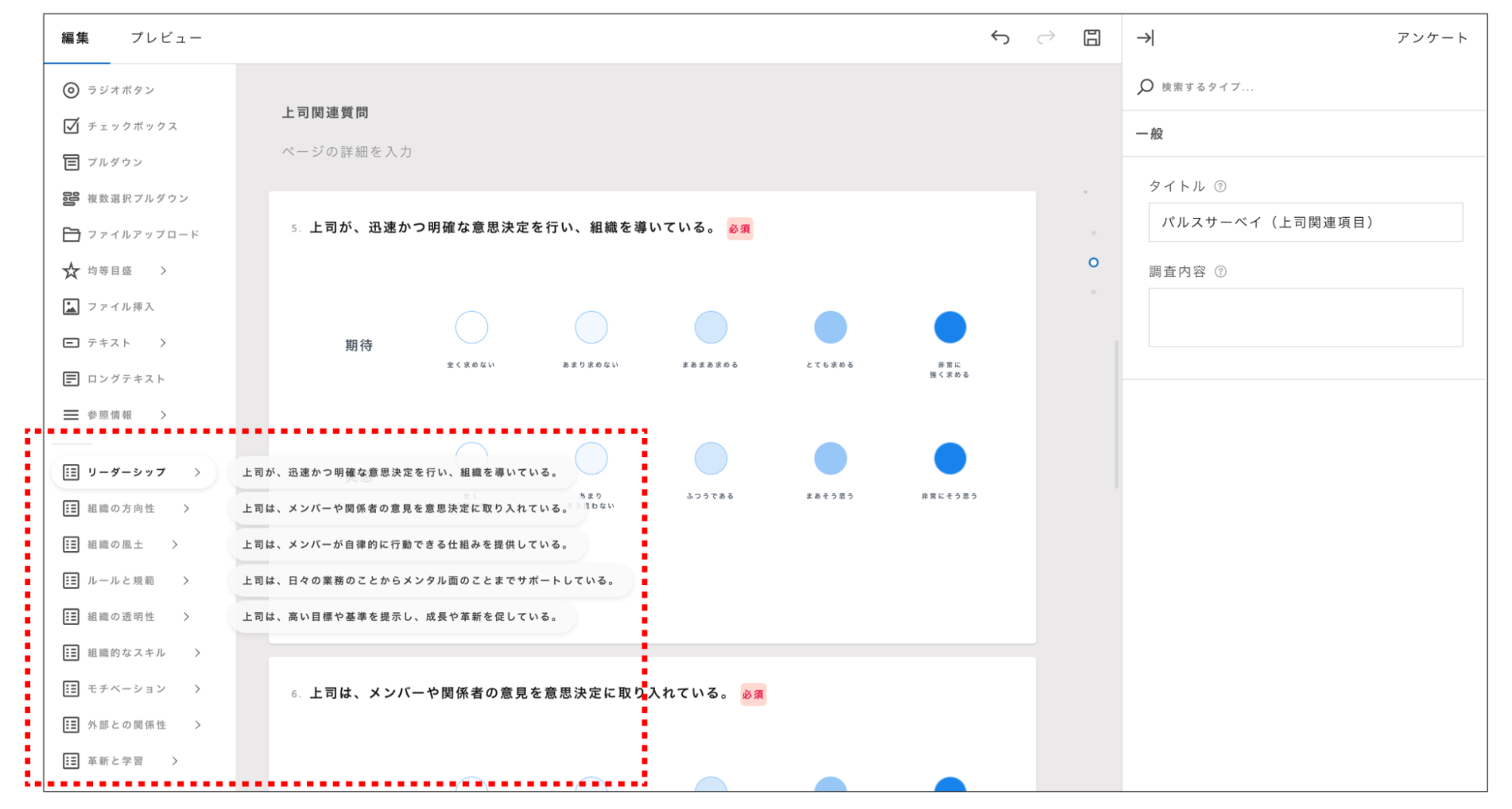 「組織診断パルス機能」は、これまで「センサス」でのみ利用可能だった設問項目を、人事担当者が任意に作成するサーベイでも一部設定できるようにした機能です。これにより、人事担当者はより高い頻度で、正確に組織の状態を把握することができます。